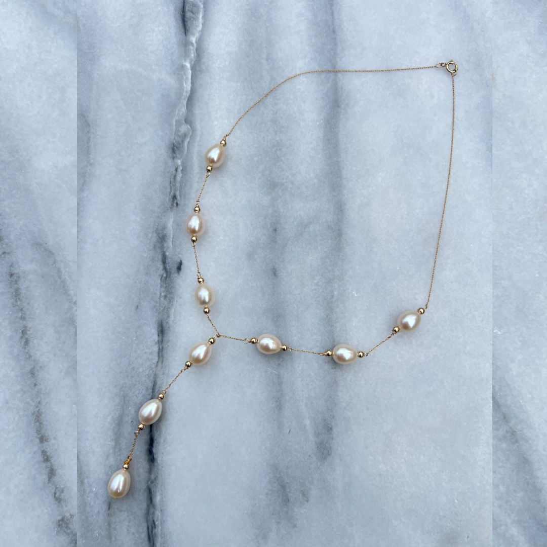 Embrace the refined elegance of our Freshwater Pearl Lariat Necklace, where the softness of freshwater pearls meets the understated sophistication of 14k gold. Whether worn for a special occasion or as a refined everyday accent, this necklace effortlessly elevates any look with its timeless charm and versatile style.