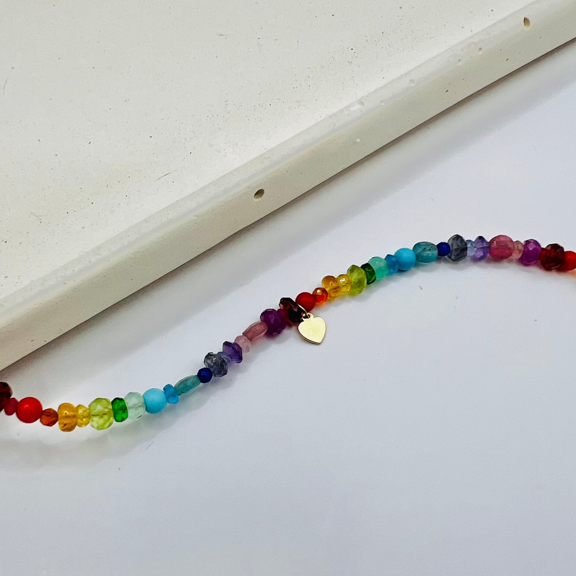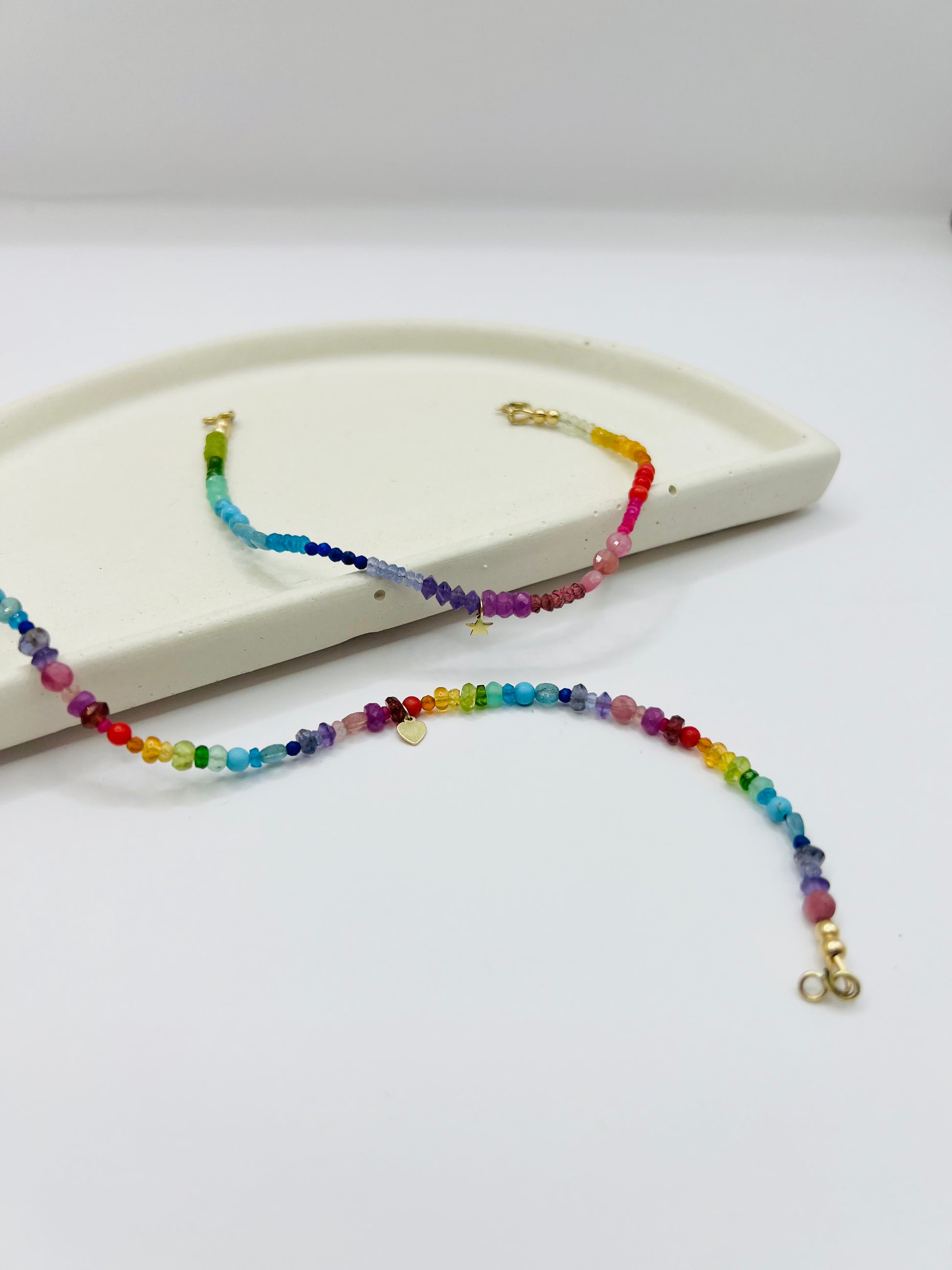 The delicate bracelet is adorned with a 14k gold tiny heart or star charm, adding a touch of whimsy and charm. Secured with a spring clasp and findings, it's not just a necklace—it's a celebration of friendship and vibrant elegance.