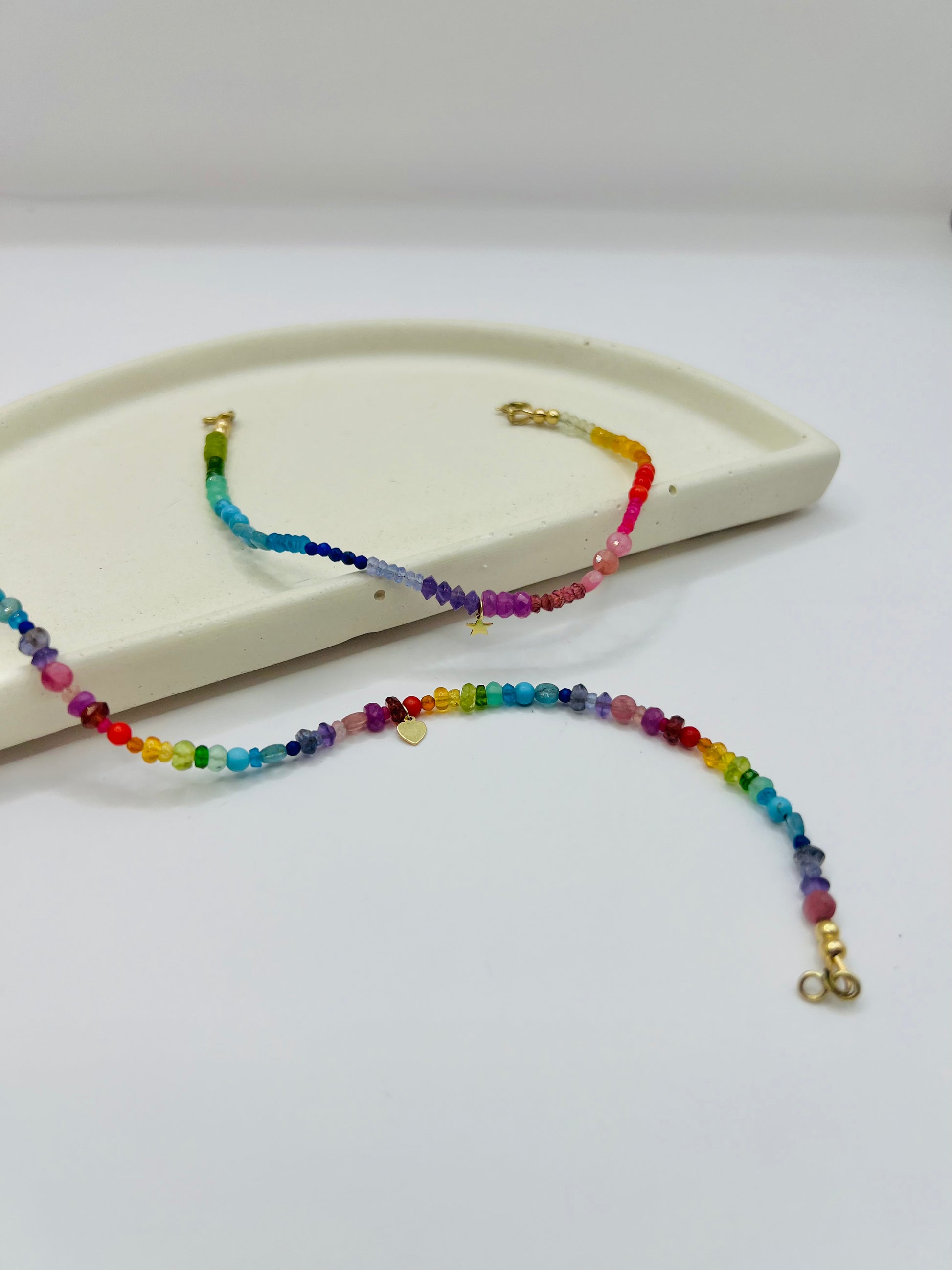 The delicate bracelet is adorned with a 14k gold tiny heart or star charm, adding a touch of whimsy and charm. Secured with a spring clasp and findings, it's not just a necklace—it's a celebration of friendship and vibrant elegance.