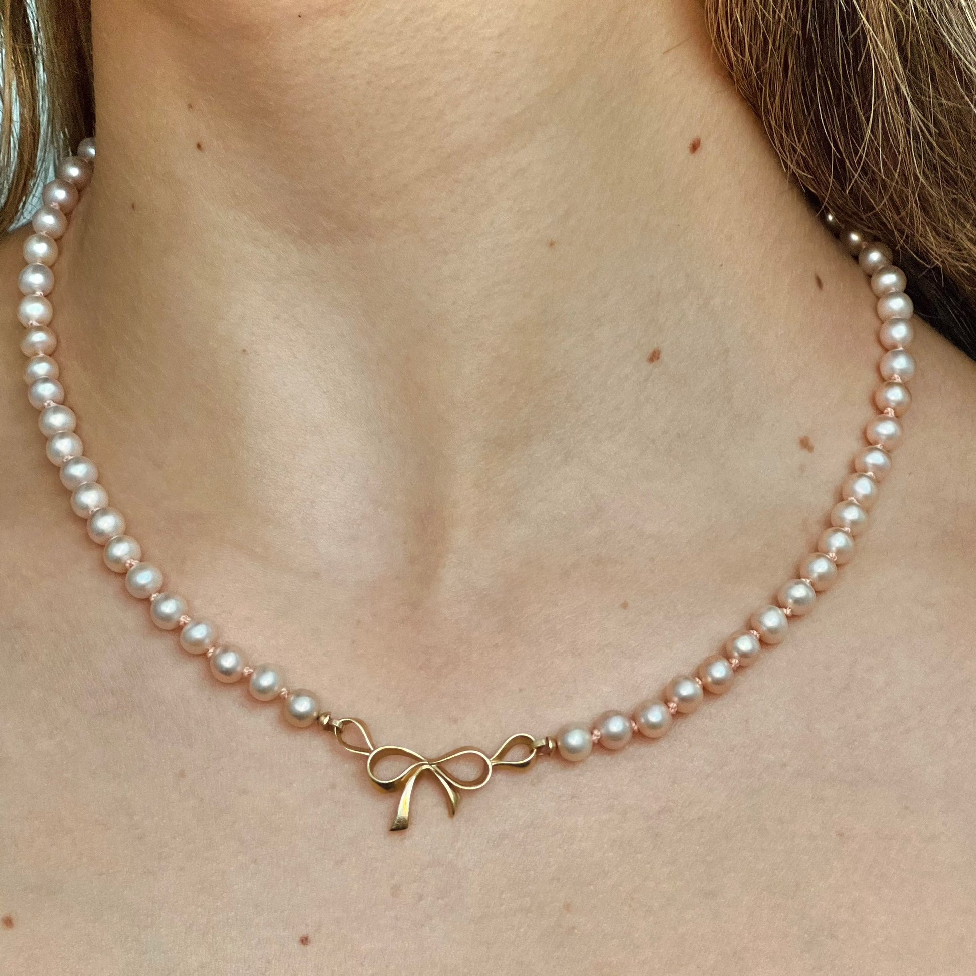 Pink Pearl and 14k Gold Bow Necklace—a graceful fusion of elegance and sophistication. Each pink pearl is delicately hand-knotted with light pink thread, creating a luminous strand of timeless beauty. The centerpiece, a meticulously crafted 14k gold bow, adds a touch of refined luxury.