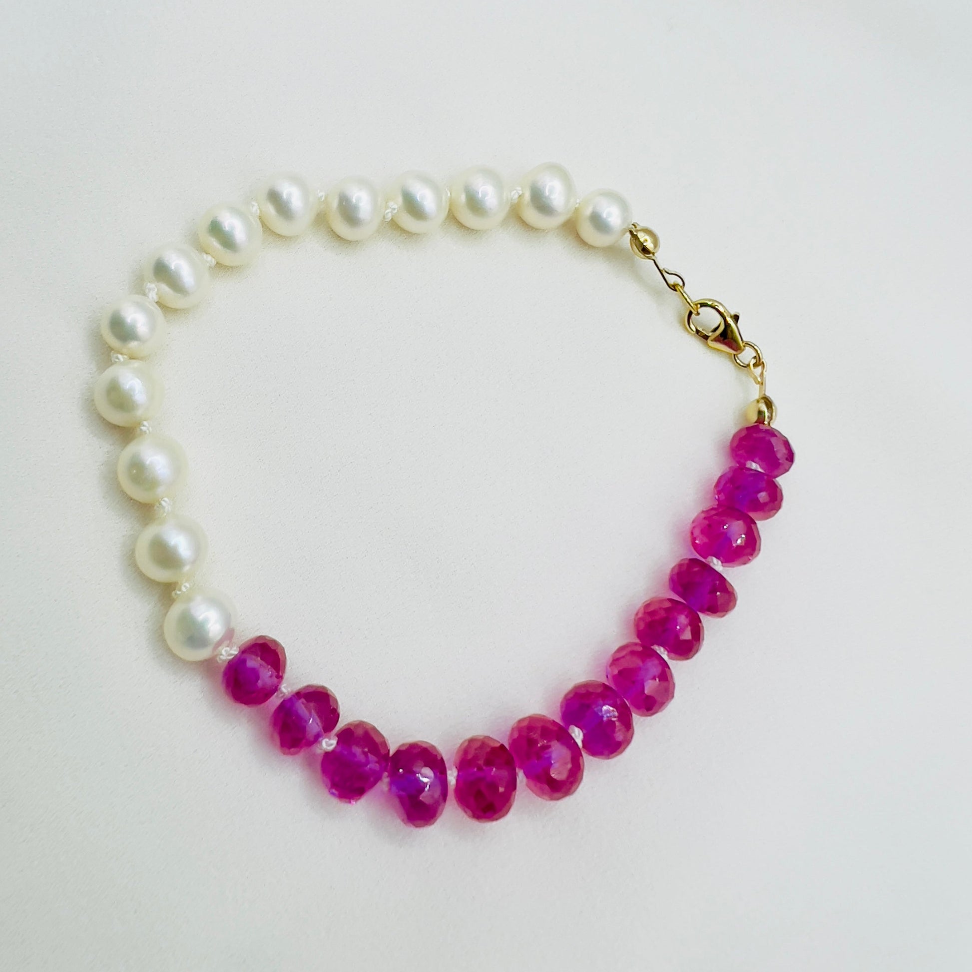 Meticulously hand-knotted with white thread, each Pink Sapphire and White Pearl is thoughtfully arranged, creating a bracelet that exudes feminine grace.